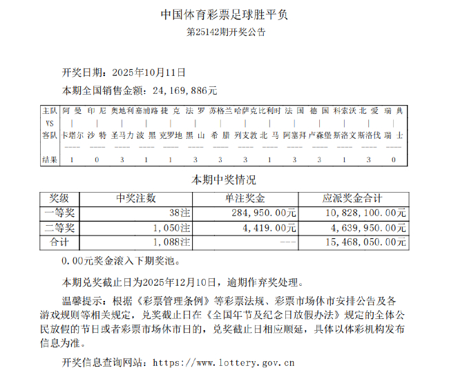 北京本事10月11日,赢输彩第25142期开奖效果揭晓。本期一等奖开出38注,单注奖金284,950元,二等奖1,050注,单注奖金4,419元;任九开出11,129注674元。本期足彩销量为24,169,886元,任九投注总数为11,734,754元。