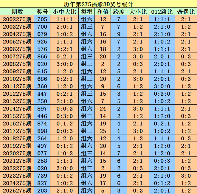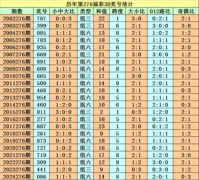 在积年同时开奖中,组三出现9次,组六开出14次,昨年同时开出组六,本年同时看好组六再出。