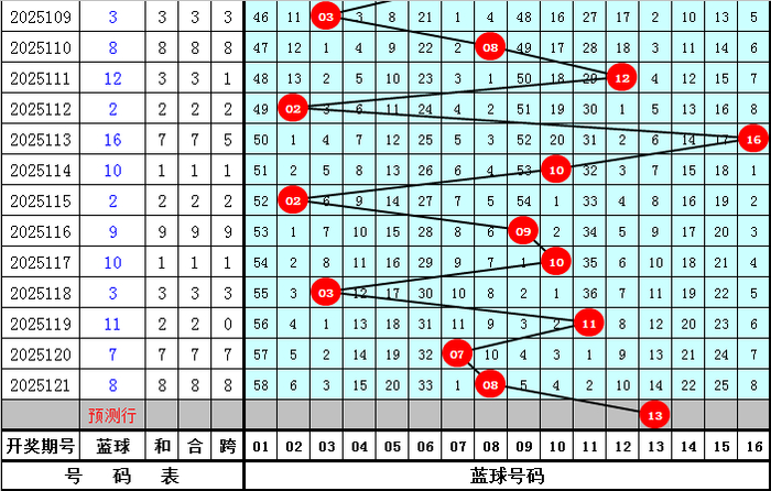 本期蓝球瞻望出现时:06、09、10、11、13之中,蓝球绝杀8码:01、03、05、07、08、12、14、15。